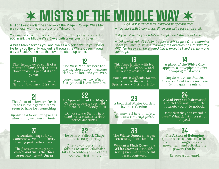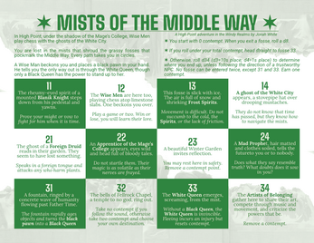 Lost in the mists, pursued by a White Queen, your only hope is to take the advice of the Wise Chessmasters and navigate the misty fosses of the Middle Way.